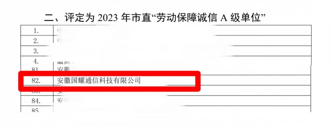 近日,六安市人力資源和社會保障局公布了用人單位勞動保障誠信守法等級評定結(jié)果,授予安徽國耀通信科技有限公司2023 年市直“勞動保障誠信 A 級單位”榮譽稱號。