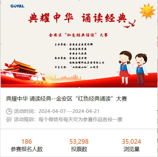 在中華人民共和國(guó)成立75周年之際,為深入學(xué)習(xí)貫徹黨的二十大精神,營(yíng)造濃厚的愛(ài)國(guó)主義教育氛圍,厚植青少年家國(guó)情懷,中共金安區(qū)區(qū)委宣傳部、金安區(qū)文旅局、金安區(qū)教育局、金安區(qū)圖書(shū)館、文化館及安徽國(guó)耀科技集團(tuán)有限公司聯(lián)合舉辦了“典耀中華·誦讀經(jīng)典——金安區(qū)‘紅色經(jīng)典誦讀’大賽”。